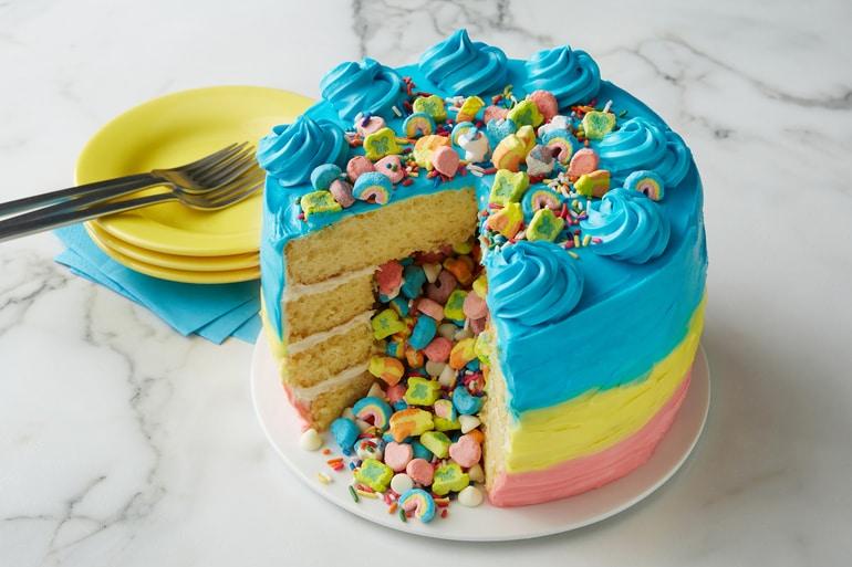 This stunning and magical cake is sure to delight the little leprechauns in your life. Slice into it to reveal a hidden surprise: a center bursting with Lucky Charms™ marshmallows, rainbow sprinkles and more!