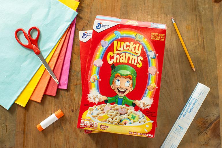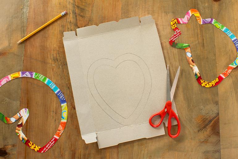 - Break down cereal boxes so they lay flat on the table. Using the larger areas of the front and back panels of the box, draw charm shapes. You will be cutting out the inner core of the shape, so make sure to draw a nice thick border. Cut them out and set aside.