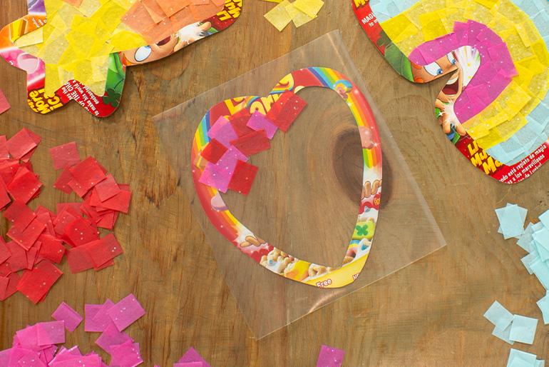 - Peel the backing off the contact paper cutouts and place onto your work surface, sticky side up. Arrange the tissue paper onto the sticky side of the contact paper. *NOTE: you can place the cut charm shape behind the contact paper to help guide you with placement of the tissue paper.