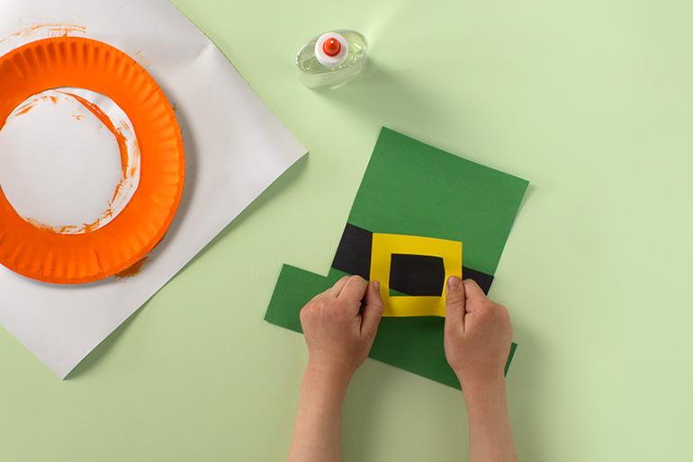 - Glue the black rectangle onto the green hat for the hat band. Then glue the yellow square on top for the buckle. Attach the hat to the top of the orange paper plate.