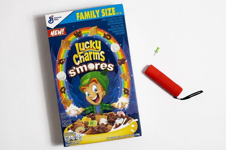 - Usando un alfiler, perfora la caja para crear los contornos y las formas que te gustaría ver en tu caja mágicamente deliciosa de Lucky Charms.